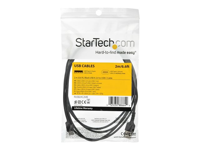 RUSB2AC2MB - StarTech.com 2m USB A to USB C Charging Cable, Durable Fast Charge & Sync USB 2.0 to USB Type C Data Cord, Rugged TPE Jacket Aramid Fiber M/M 3A Black, Samsung S10, S20, iPad Pro, Pixel